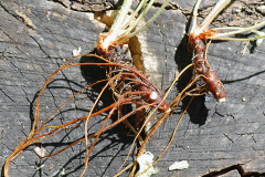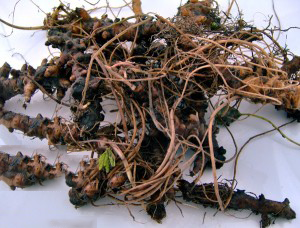 Root Creeping roots are woody, knotty, and about 1 inch thick, with creamy white centers