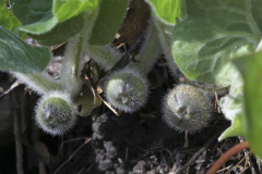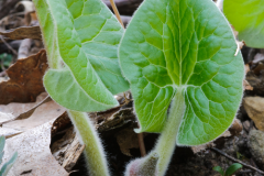 Each plant has a pair of basal leaves on stalks up to 6 inches long. Leaves are heart to kidney shaped with a pointed or rounded tip and a deep cleft at the base, the underside densely covered in soft hairs. The leaf stalks are gray-white, also densely covered with soft white hairs. On a mature plant, leaves are 6 to 8 inches long and wide, but are less than half that size when the plant first blooms. When leaves first emerge they are folded up and flat like a book, but unfurl within a couple days.