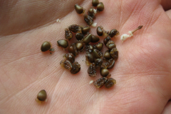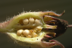 Fertile flowers are followed by a 6-celled fleshy seed capsule. The capsule consists of numerous dark brown, somewhat 3-sided hard seeds. While plants can be started from seed, it takes a while. For germination, seeds need a cold moist storage period of 60 to 90 days, then a warm moist period of the same length followed by another cold period.