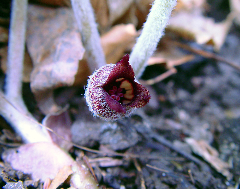 Unlike most plants, leaves of Wild Ginger totally cover its beautiful flower. Beneath the dark green leaves are small flowers that are dark red or purple-brown on a short stem. Flower is in full bloom from April to June. Flower is tubular/bowl-shaped with 3 dark red to brown triangular petal-like sepals with elongated tips. Tube is ¾ to 1 inch across. The flower is up to 2 inches across from tip to tip. The inside of the tube is creamy white; in the center is a ring of 12 stamens around the 6 reddish brown styles. The outside of the tube is covered in long white hairs, especially near the base. A plant has a single flower that lies on the ground at the base of the plant.