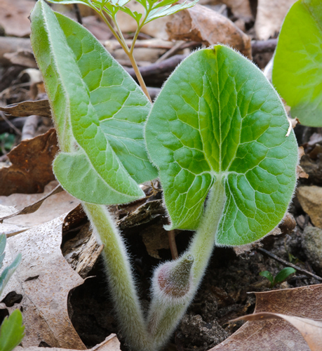 Each plant has a pair of basal leaves on stalks up to 6 inches long. Leaves are heart to kidney shaped with a pointed or rounded tip and a deep cleft at the base, the underside densely covered in soft hairs. The leaf stalks are gray-white, also densely covered with soft white hairs. On a mature plant, leaves are 6 to 8 inches long and wide, but are less than half that size when the plant first blooms. When leaves first emerge they are folded up and flat like a book, but unfurl within a couple days.