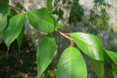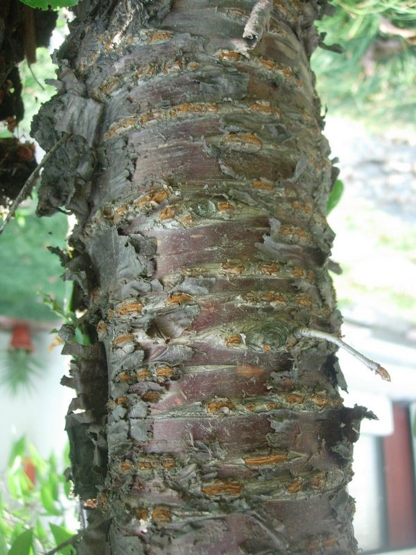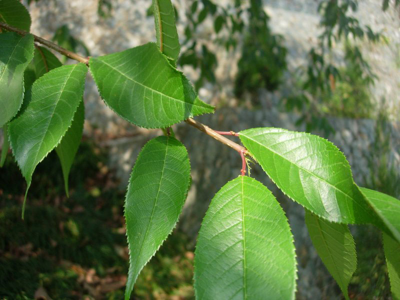 Wild Himalayan cherry is a medium sized deciduous tree that grows up to 30 meters (98 ft.) in height. The plant prefers light sandy, moisture-retentive, medium loamy and heavy clay soils and needs well drained condition. Bark is brownish-grey, smooth and peels off in thin shining horizontal stripes exposing a shining copper colored surface. Leaves are conduplicate in bud, elliptic or ovate lanceolate, 3.5-8.5 cm long, apex acuminate, both surfaces are glabrous, dark glossy, shining above, finely simple or double serrate, with gland tip teeth. Petioles are 1.2-2 cm long, stipules are long and subulate.