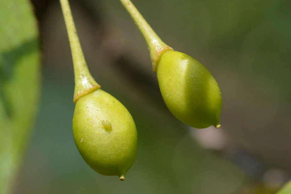 Ovoid fruit 1.2-1.5 cm long, about 15 mm in diameter, glabrous, shining, supported by base of calyx tube |