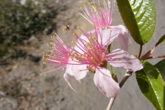 Flowers are pinkish white or crimson 1.2-2.5 cm in diameter, appearing before the leaves in umbellate fascicles and are the rich sources of nectar and pollen for bees. Pedicels are 0.5-2cm long. Calyx is bell shaped, 5-lobed, ovate-acute; petals 5, obovate. Flowering normally takes place from October and lasts up to mid-December and is pollinated by Insect. Fertile flowers are followed by ovoid fruit 1.2-1.5 cm long, about 15 mm in diameter, glabrous, shining, supported by base of calyx tube and contain one large seed. Fruits are initially yellow which turns to red as it ripens.