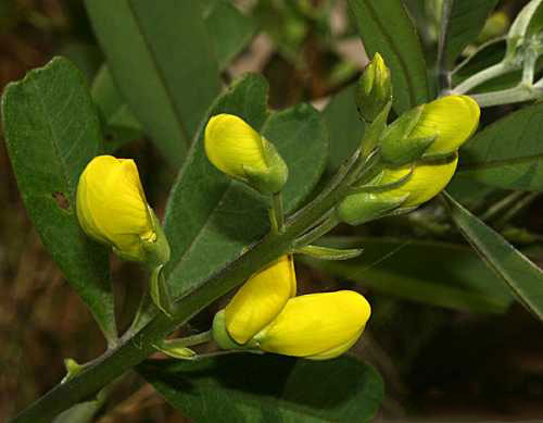 The inflorescence is a loosely constructed terminal raceme of a few flowers at the top of stems above the leaves. Each plant can have numerous racemes. Flowers are perfect, to 1/2 inch long (smaller than other Baptisias) and are on short stalks with corollas in bright yellow, but like most Baptisias, there can be significant variation in color. Green calyx is tubular with 5 pointed lobes while the corolla forms a pea-type flower consisting of 5 petals with the large banner petal turned upward with a notch at the center, and the sides reflexed backward. There are two lateral petals projecting forward which enclose the two keel petals that are usually of a lighter shade, which in turn, house the reproductive parts, which include 10 stamens with yellow anthers and a single style.