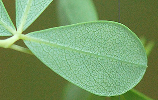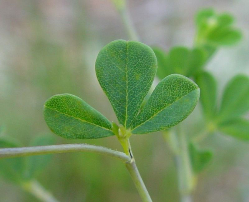 Leaf Subsessile, 3-foliate-palmate; the leaflets small, roundish, or obovate, acute at base, very obtuse at apex, bluish-green in color, and turn black on drying. The stipules are setaceous and caducous. The leaf underside is paler in color, showing a fine vein network between the lateral veins