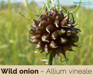 Wild onion (Allium vineale), also called scallions, and wild garlic, is a upright, erect, long-lived, perennial, herbaceous plant perennial plant in Liliaceae family that grows about 30-60 cm tall, but sometimes reaching up to 1 m in height. The plant is found growing in prairie remnants and other areas along railroads, degraded meadows near rivers or woodlands, woodland borders and thickets, vacant lots, grassy clay banks, poorly maintained lawns, and waste areas. The plant prefers heavy soil containing some clay. However, other kinds of soil are tolerated as well.