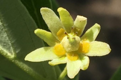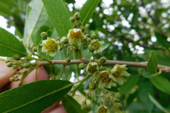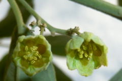 Flowers are small, bell shaped and actinomorphic. Tree is dioecious. Flowers are pale yellow to greenish white and about 1 cm in diameter. The 5 Sepals are almost free. There are 5 Petals, each with a small somewhat fleshy scale attached to the base. Both male and female flowers have longish Pedicels. The Male flowers tend to droop and are in axillary Cymes. They have longish pedicels. The 10 Stamens alternate with the petals and have short Filaments. Their Anthers have 2 pollen sacs opening by terminal pores. The ovary is absent. The Female flowers are solitary, on slender hairy pedicels about 1.5 cm long and situated in axils of leaves. There is a single Pistil. The sessile superior Ovary is pubescent. The Style is divided into 5 branches and is short and thick.