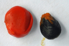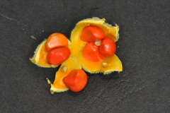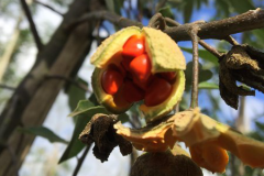 Fruit is an almost spherical, knobbly, olive green, hairy Capsule up to 2 cm in width and perched on a stalk. Fruit is rough and splits into 4 or 5 valves. This splitting reveals an orange to red, oily coat which completely covers each seed. Seeds are black and about 0.7 cm in diameter. The testa is slightly woody. The cotyledons are flat and the endosperm is fleshy.
