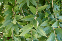 The tree is usually evergreen. Leaves are simple, spirally or alternatively arranged. An occasional bright yellow leaf may be seen. Leaves are oval, oblong to elliptic or even lance-shaped. They are up to 16 cm long and 8 cm wide but usually smaller. Blade is leathery and may be smooth or hairy on both sides. On the upper surface the veins are sunken and a fresh grey to dark green color. Lower surface is usually lighter, blue green, yellowish or whitish and may be hairy. Veins are yellowish or reddish-velvety and protrude below. Lateral veins almost reach the margin. Domatia may be present in the axils of the lateral veins. When present, domatia are fringed with hairs and usually occur on the lower surface. The Apex is pointed or rounded. The base is rounded or narrow. Margins are slightly wavy, entire or unevenly toothed mainly on young and coppice growth. Petiole is yellow and up to 2cm long. Stipules are absent. Hydrocyanic acid has been found in the leaves.