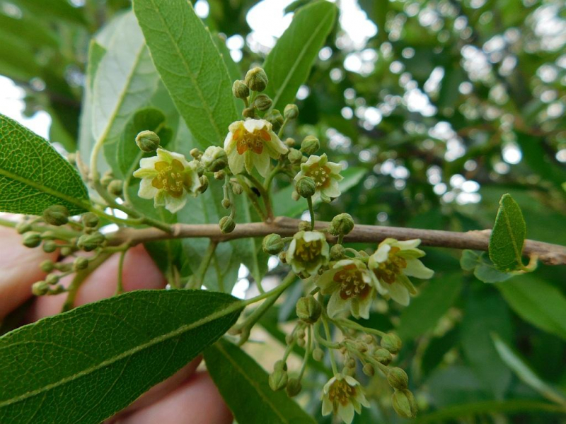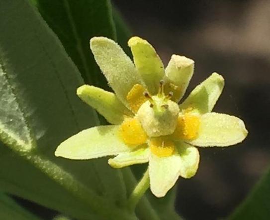 Flowers are small, bell shaped and actinomorphic. Tree is dioecious. Flowers are pale yellow to greenish white and about 1 cm in diameter. The 5 Sepals are almost free. There are 5 Petals, each with a small somewhat fleshy scale attached to the base. Both male and female flowers have longish Pedicels. The Male flowers tend to droop and are in axillary Cymes. They have longish pedicels. The 10 Stamens alternate with the petals and have short Filaments. Their Anthers have 2 pollen sacs opening by terminal pores. The ovary is absent. The Female flowers are solitary, on slender hairy pedicels about 1.5 cm long and situated in axils of leaves. There is a single Pistil. The sessile superior Ovary is pubescent. The Style is divided into 5 branches and is short and thick.
