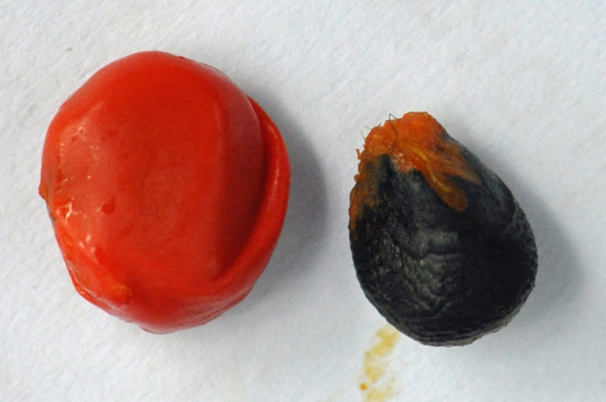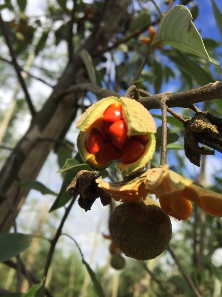 Fruit is an almost spherical, knobbly, olive green, hairy Capsule up to 2 cm in width and perched on a stalk. Fruit is rough and splits into 4 or 5 valves. This splitting reveals an orange to red, oily coat which completely covers each seed. Seeds are black and about 0.7 cm in diameter. The testa is slightly woody. The cotyledons are flat and the endosperm is fleshy.