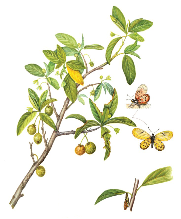 Kiggelaria africana also known as the wild peach or umKokoko is a large, robust, low-branching African tree, and is currently the only recognized species in the genus Kiggelaria. Despite its common name, Kiggelaria africana is not related to the more familiar fruit-producing peach tree (Prunus persica) although the leaves do look similar, if only very superficially. Unlike peach leaves, they are fairly thick and stiff, with a thin coating of fur on the undersides. The tree grows across Tanzania through Malawi, Zimbabwe and Mozambique to Swaziland, Lesotho and southern South Africa. It occurs naturally in Afromontane forests as well as by the coast, in bushveld and along rivers. Few of the popular common names of the plant are wild peach, umKokoko, Porkwood, Wildeperske, Mahogany, Pink wood, Red Ebony, Red Ivory, Red Ivory wood, Royal Redwood and Fatherland’s Redwood. Kiggelaria is actually named after Franz Kiggelaar who was the curator of the Simon Von Beaumonts garden in the Hague (1648 – 1722). africana from Africa. There is only one species in this genus in Southern Africa.