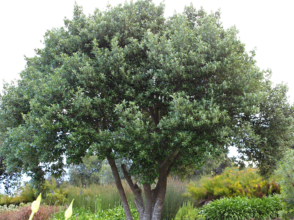 The tree is usually evergreen. Leaves are simple, spirally or alternatively arranged. An occasional bright yellow leaf may be seen. Leaves are oval, oblong to elliptic or even lance-shaped. They are up to 16 cm long and 8 cm wide but usually smaller. Blade is leathery and may be smooth or hairy on both sides. On the upper surface the veins are sunken and a fresh grey to dark green color. Lower surface is usually lighter, blue green, yellowish or whitish and may be hairy. Veins are yellowish or reddish-velvety and protrude below. Lateral veins almost reach the margin. Domatia may be present in the axils of the lateral veins. When present, domatia are fringed with hairs and usually occur on the lower surface. The Apex is pointed or rounded. The base is rounded or narrow. Margins are slightly wavy, entire or unevenly toothed mainly on young and coppice growth. Petiole is yellow and up to 2cm long. Stipules are absent. Hydrocyanic acid has been found in the leaves.