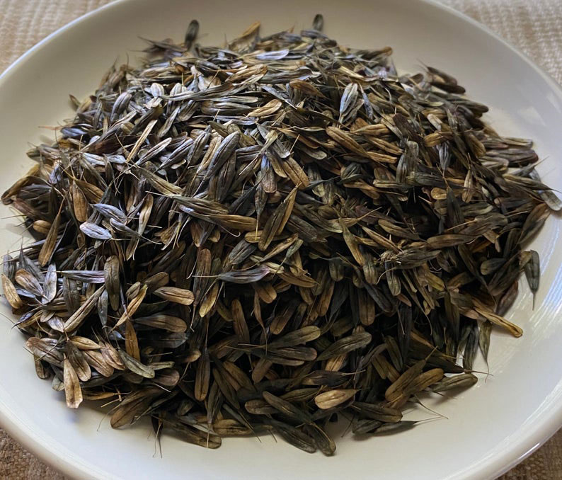 Seeds are mostly single, but occasionally a second seed is produced but is not viable. The dull brownish yellow seeds are cylindrical and weigh 3.9 mg and grooved into two unequal halves. Plants may produce 350 to 500 seeds each, but selected plants have been known to produce more than 10,000 seeds in one year.