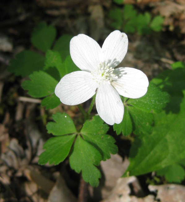 Flowers are solitary, held above the foliage on short stems, with a whorl of three palmate or palmately-lobed leaves like bracts beneath. The flowers are 2 centimeters (0.8 in) diameter, with six or seven (and on rare occasions eight to ten) tepals (petal-like segments) with many stamens. In the wild the flowers are usually white but may be pinkish, lilac or blue, and often have a darker tint on the backs of the tepals. Flowering normally occurs from March to May. Flowers are followed by elliptic, hairy, short-tipped, 4–5 mm (0.15–0.2 in.) long achene. The fruit when it forms is made up of many achenes (an achene is a one seeded fruit).
