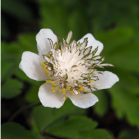 Flowers are solitary, held above the foliage on short stems, with a whorl of three palmate or palmately-lobed leaves like bracts beneath. The flowers are 2 centimeters (0.8 in) diameter, with six or seven (and on rare occasions eight to ten) tepals (petal-like segments) with many stamens. In the wild the flowers are usually white but may be pinkish, lilac or blue, and often have a darker tint on the backs of the tepals. Flowering normally occurs from March to May. Flowers are followed by elliptic, hairy, short-tipped, 4–5 mm (0.15–0.2 in.) long achene. The fruit when it forms is made up of many achenes (an achene is a one seeded fruit).