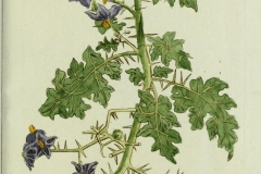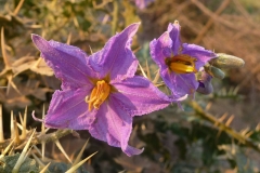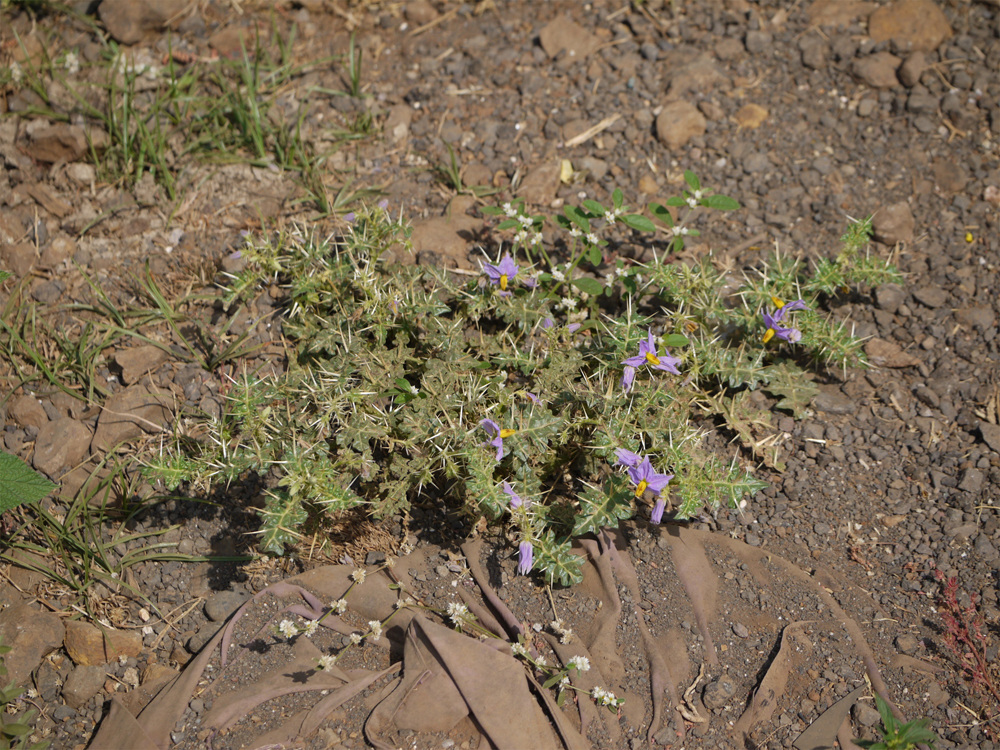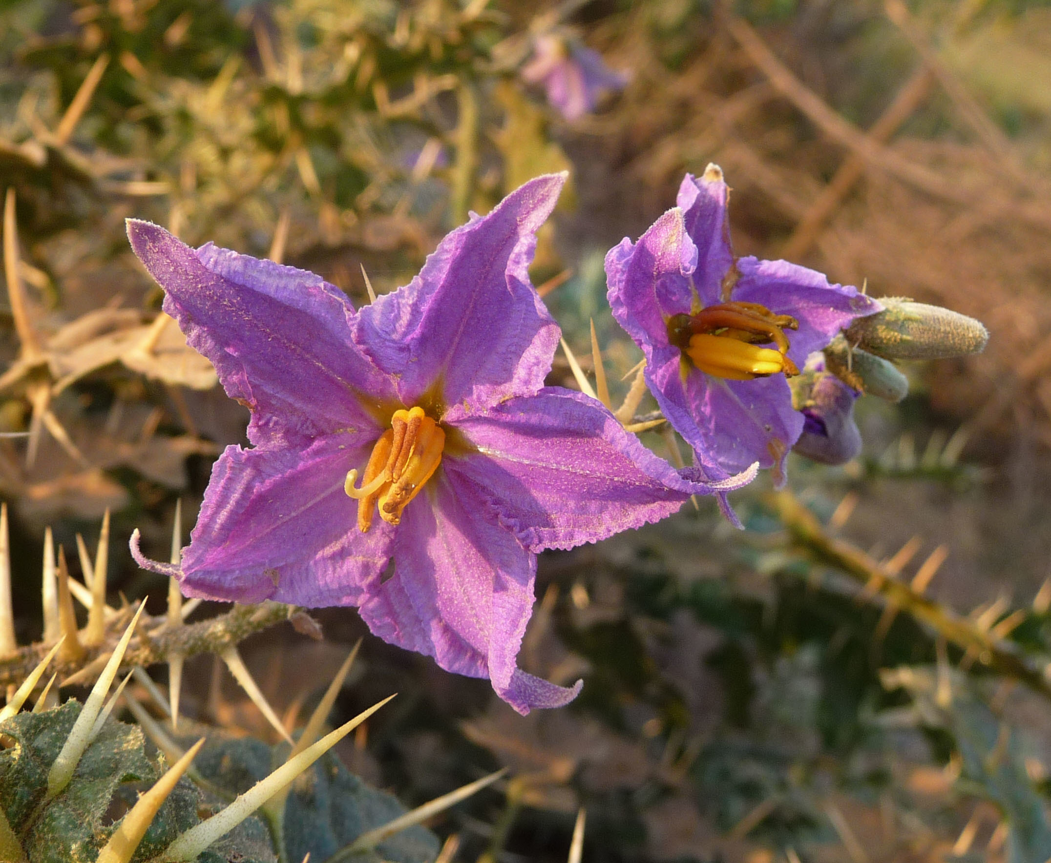 The perennial herb grows to 1.2 meters tall with woody base and profusely branched stem. Young ones are clothed with dense tomentose and stellate hairs. Stems are green when young and brownish when matured. Leaves are elliptical ovate. Flowers are solitary, blue followed by a globular fruits. Prickles are straight, compressed, shining and glabrous about 1 to 3 cm long. Leaves are subpinnatifid, sinuate, ovate or elliptic, obtuse or subacute and stellately hairy on both sides. Petioles are stellately hairy and prickly. Flowers are solitary, bisexual, actinomorphic and slightly zygomorphic. Calyx is synsepalous, pricky and densely hairy. Corolla is sympetalous that ranges from forms with short tube. Petals are violet with deltoid, acute and hairy lobes. Stamens are distinct which alternate with lobes of corolla and adnate to corolla tube or perigynous zone. Anther filament is glabrous, long and anther opens by a pore. Gynoecium has single compound pistil of 2 carpels, a single style, superior ovary having 2 or rarely more locules. Ovary is glabrous and ovoid. A nectary disk is found around the base of ovary. Fruit is a septicidal capsule or berry which possesses a sweet smell and attracts livestock and wild herbivores. Seeds inside the fruit are glabrous.