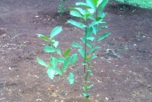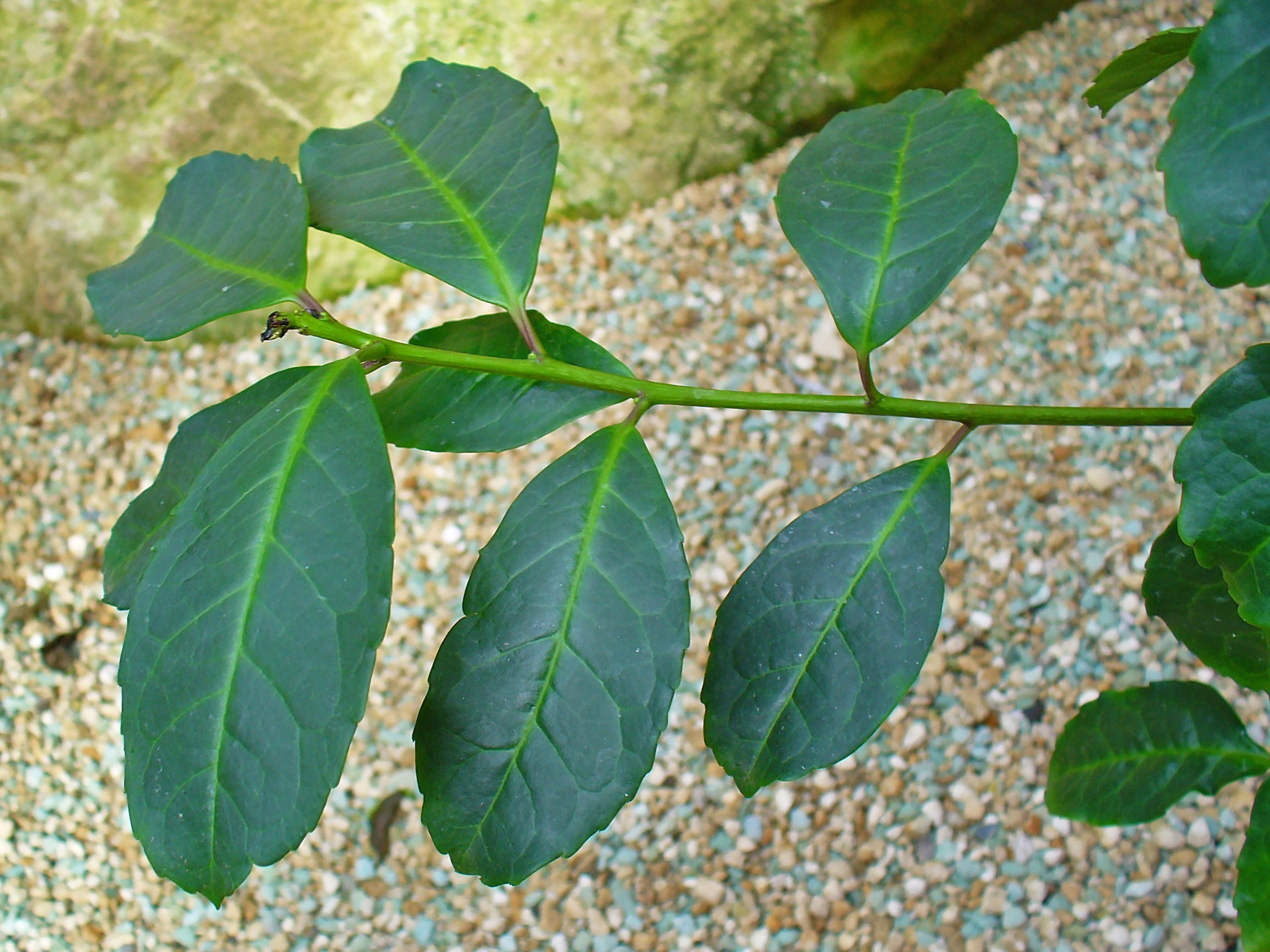 The plant bears alternate leaves, oblong to oval in shape and is acuminate with serrate or crenate margins. Leaves are leathery, glossy and pale green on lower surface & dark green on above surface. It has dark red petioles which is 1.27 cm long. The leaves are tough, coriaceous and measures about 7 to 11 cm long and 3 to 5.5 cm wide.